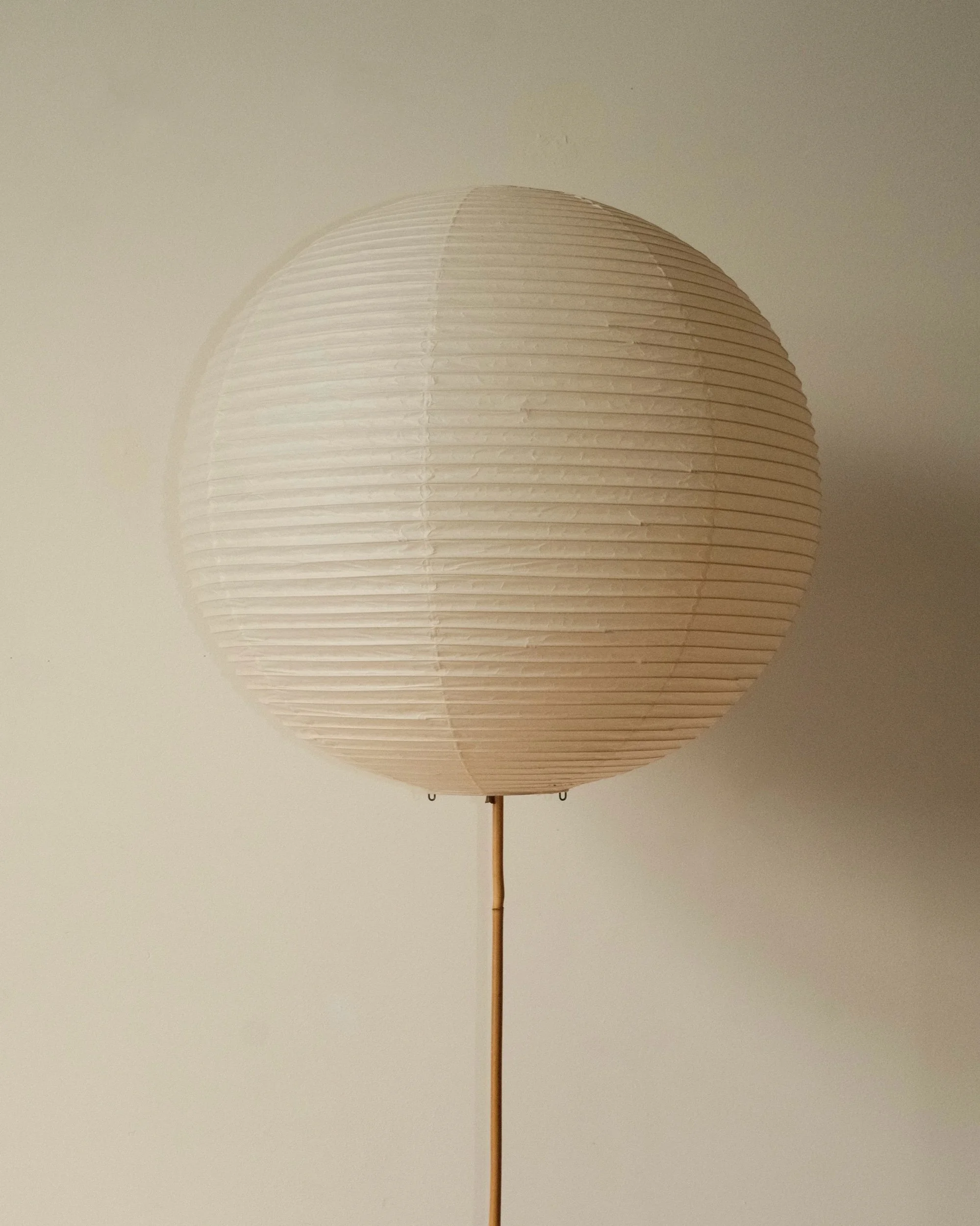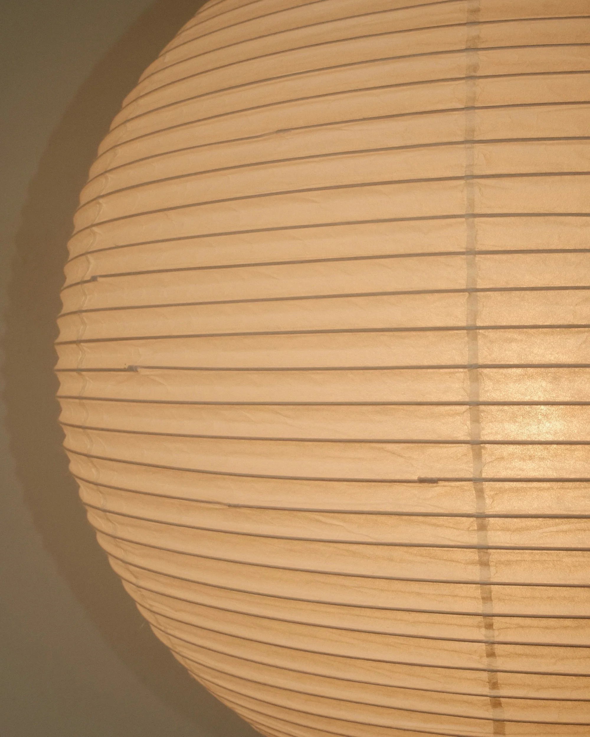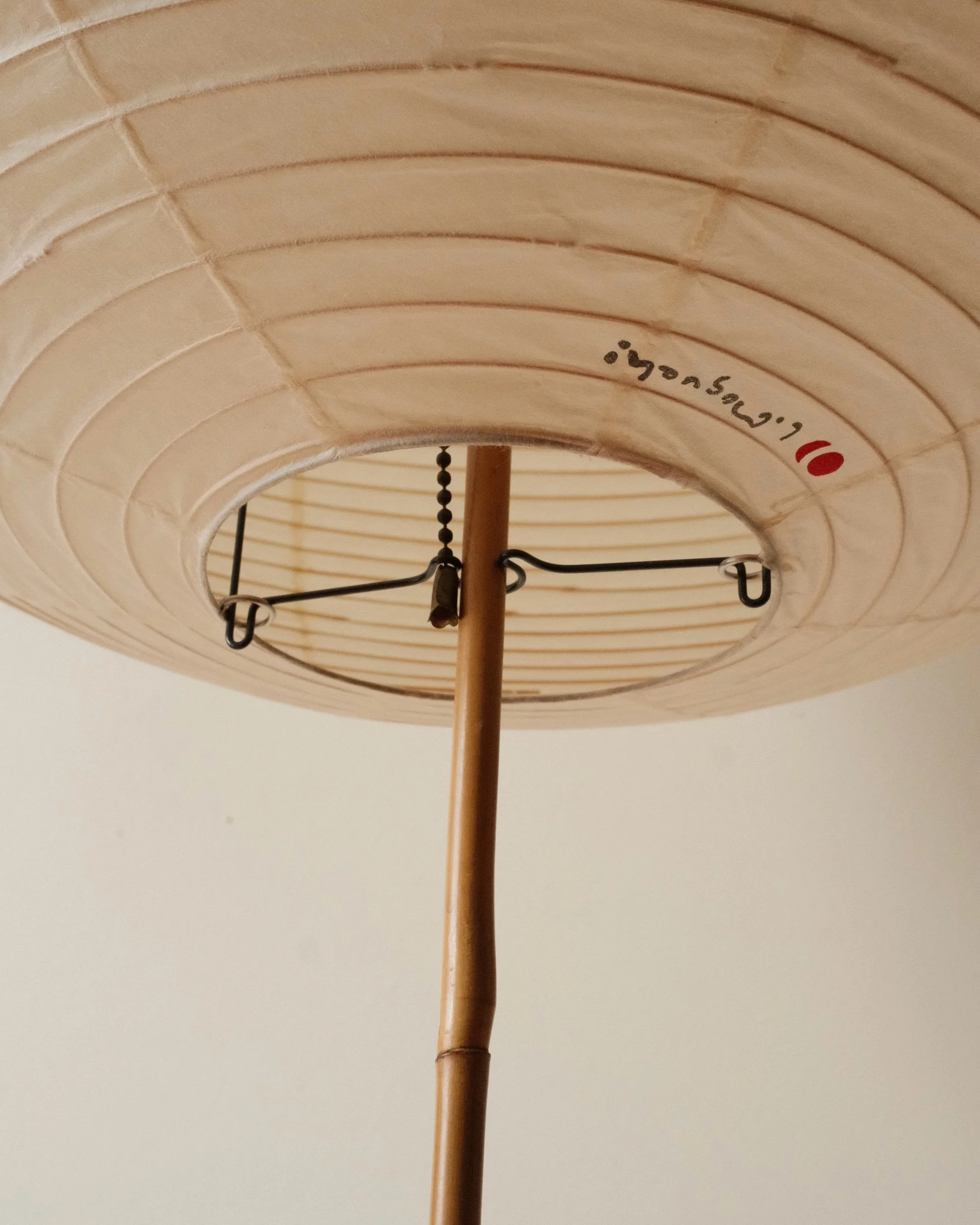 Materials: Handmade washi paper and bamboo ribbing, sitting on a bamboo stand and iron base as counterweight.