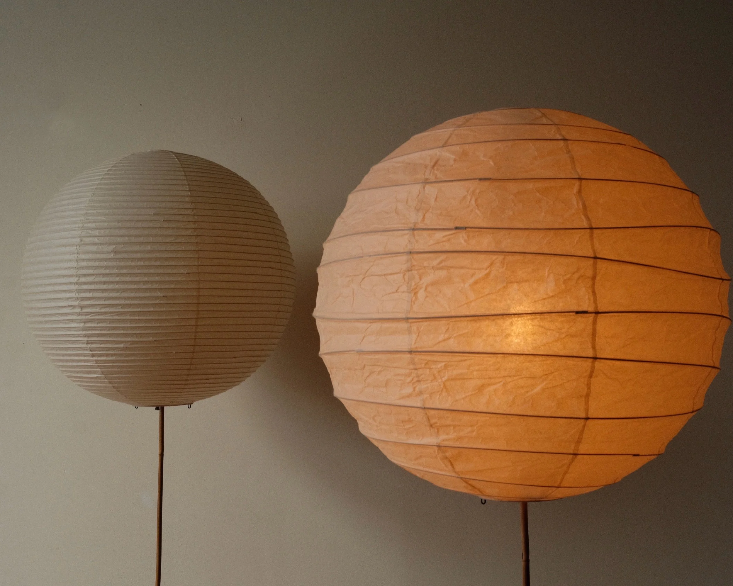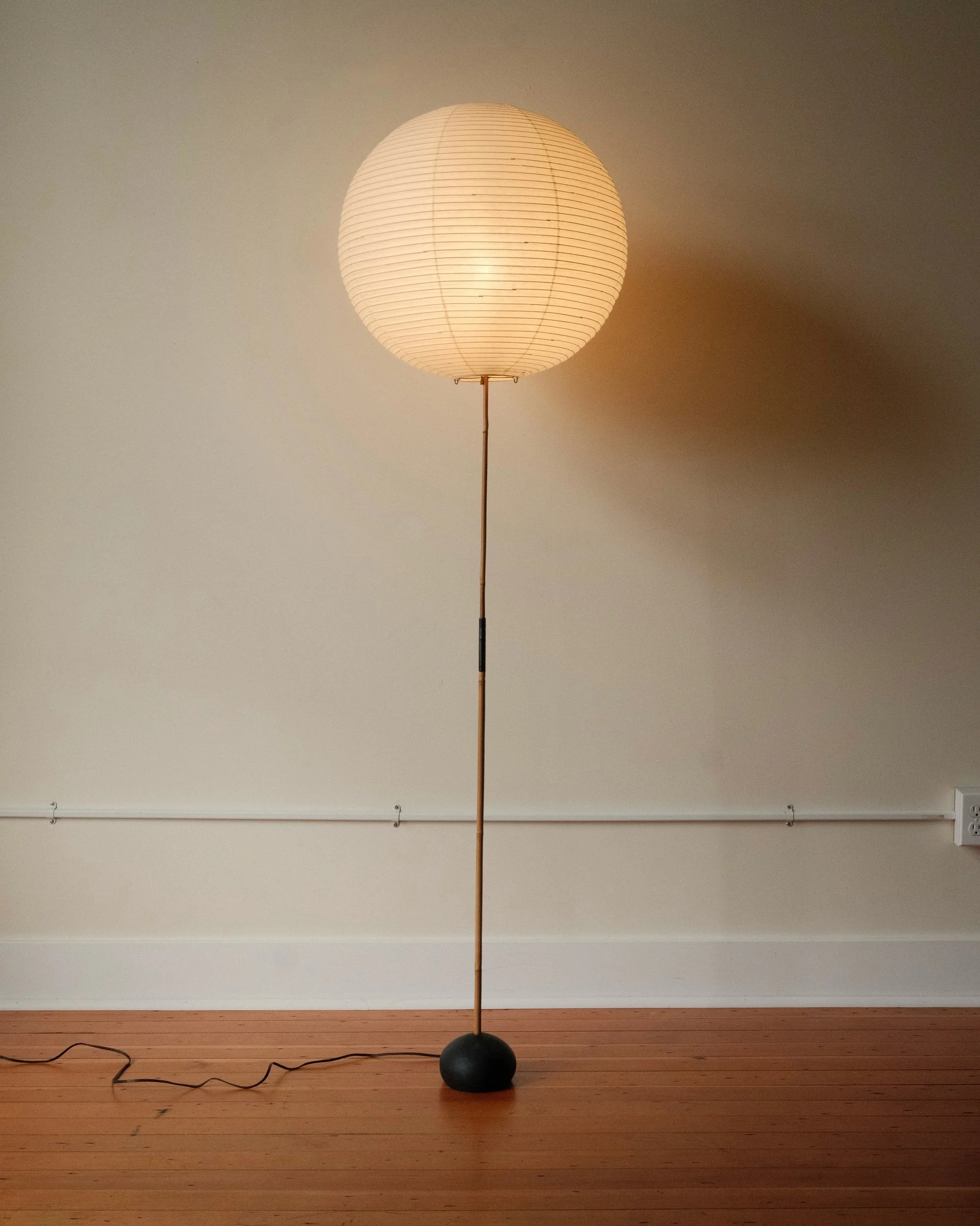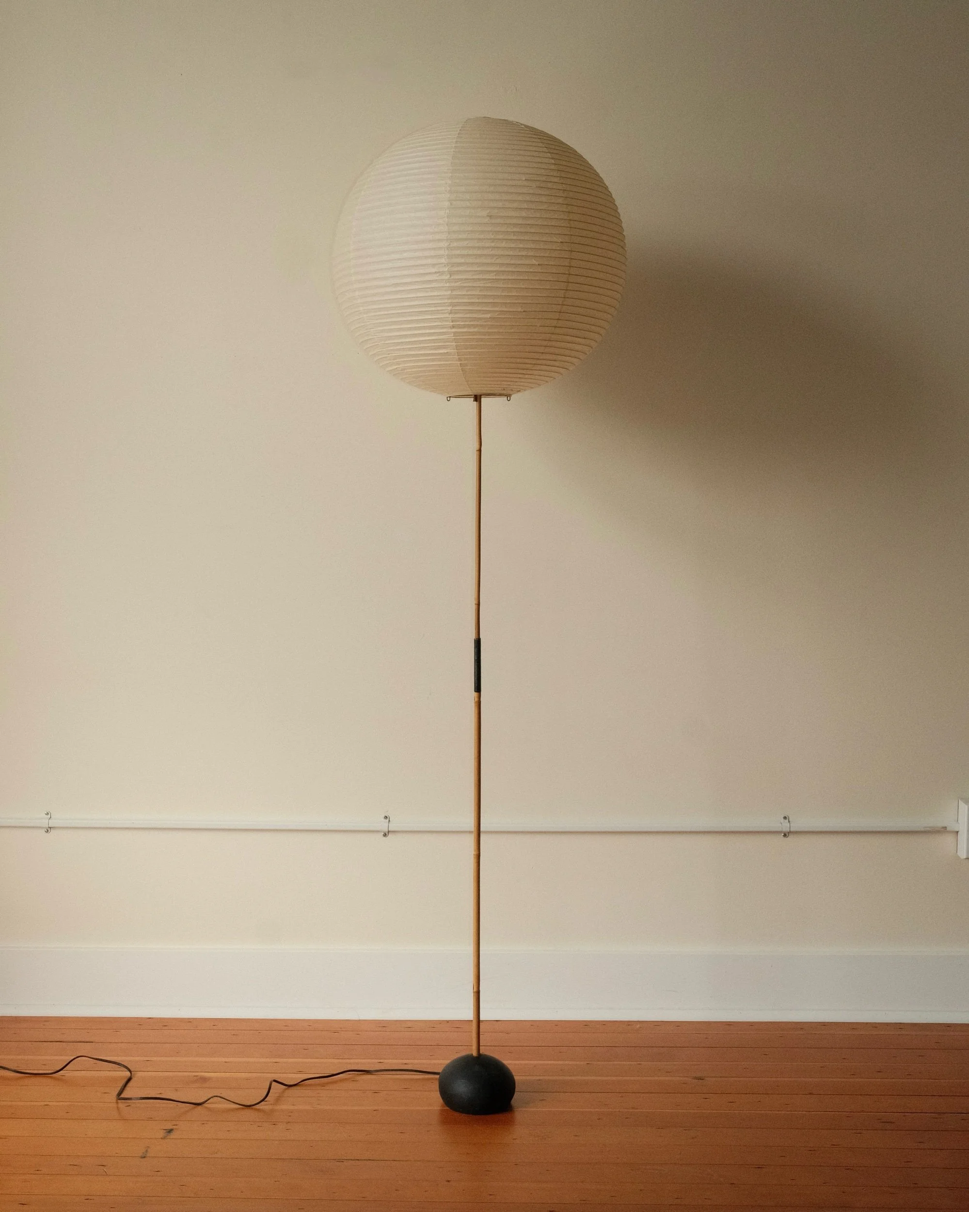 Materials: Handmade washi paper and bamboo ribbing, sitting on a bamboo stand and iron base as counterweight.